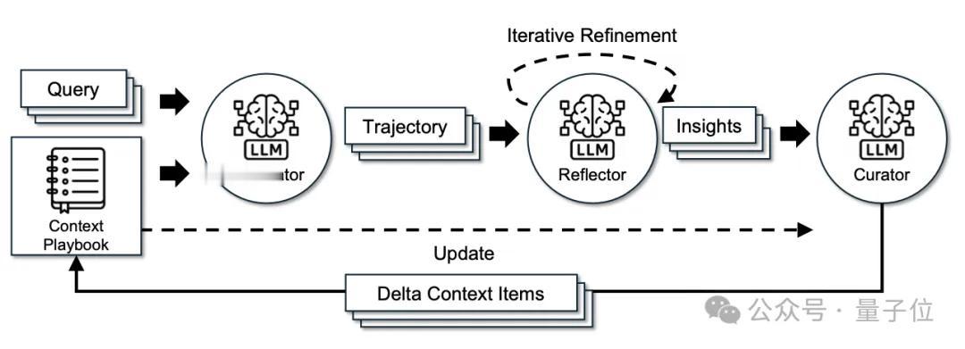 生成器(Generator):负责生成推理轨迹; 反思器(Reflector):负责从成功和错误中提炼具体见解; 整理器(Curator):负责将这些见解整合到结构化的上下文更新中。
