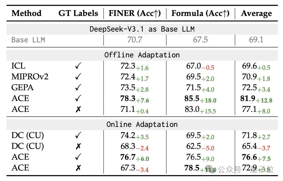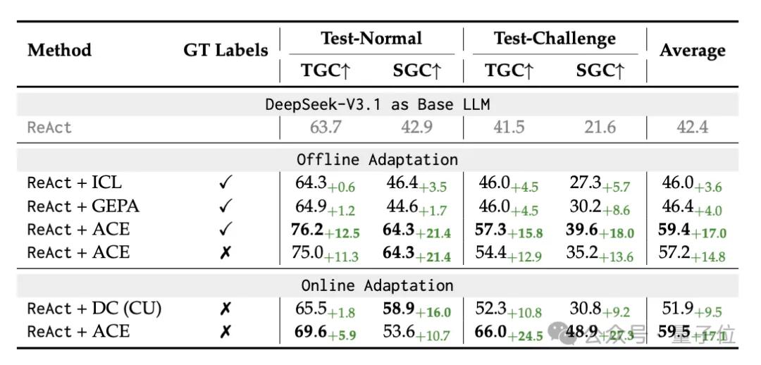 在智能体和特定领域的基准测试中,ACE能同时优化离线上下文(如system prompt)和在线上下文(如agent memory),并稳定优于强力基线模型。