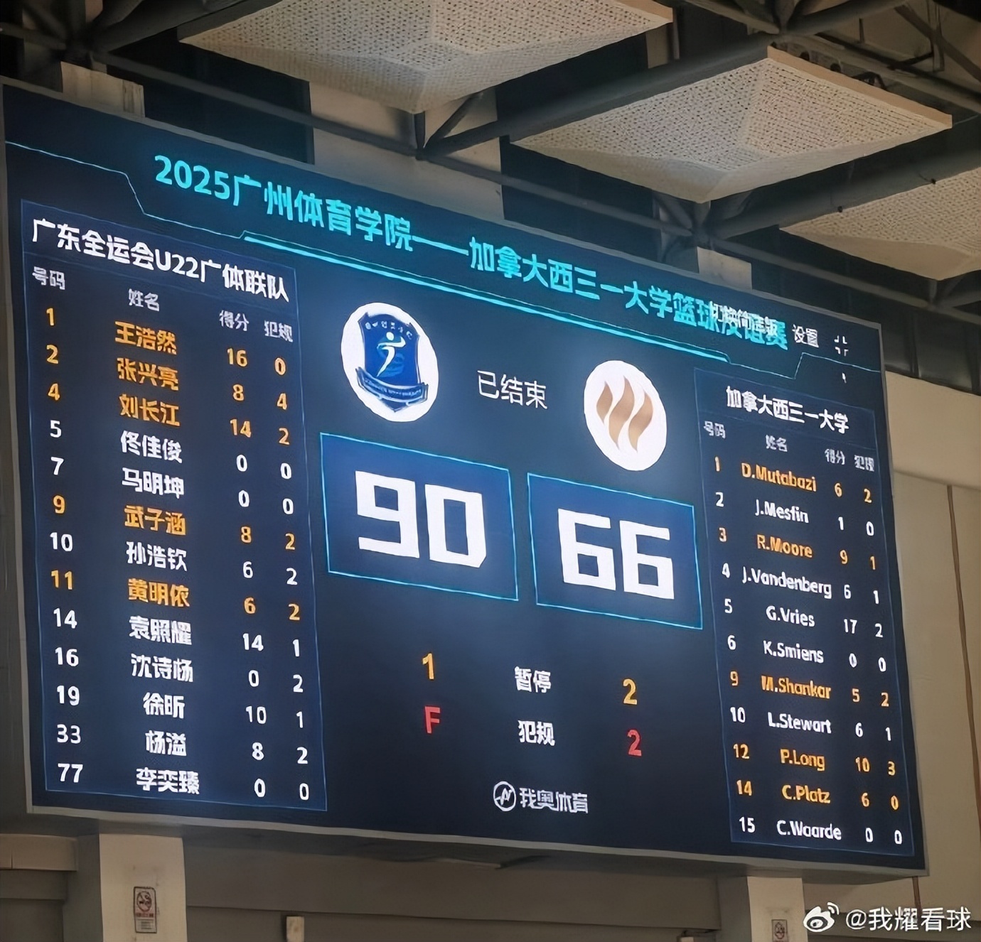 昨天,广东全运U22男篮来到了广州体育学院和加拿大西三一大学校队打了场友谊赛,最终以24分的优势轻取对手。