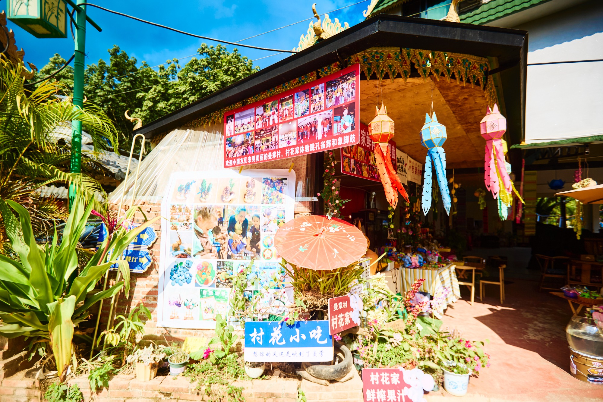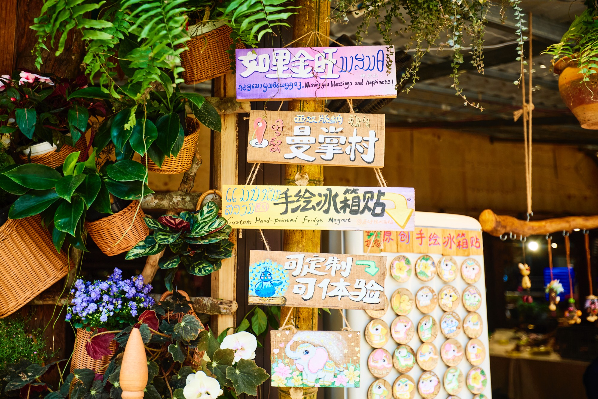 商街面积不大,处处洋溢着花团锦簇的热带风情。路边店铺从售卖菠萝蜜干、芒果干的小吃店到文创手工艺品店,从抓娃娃机到自己动手做扎染的体验馆,满是原汁原味的傣家风情和手作体验。