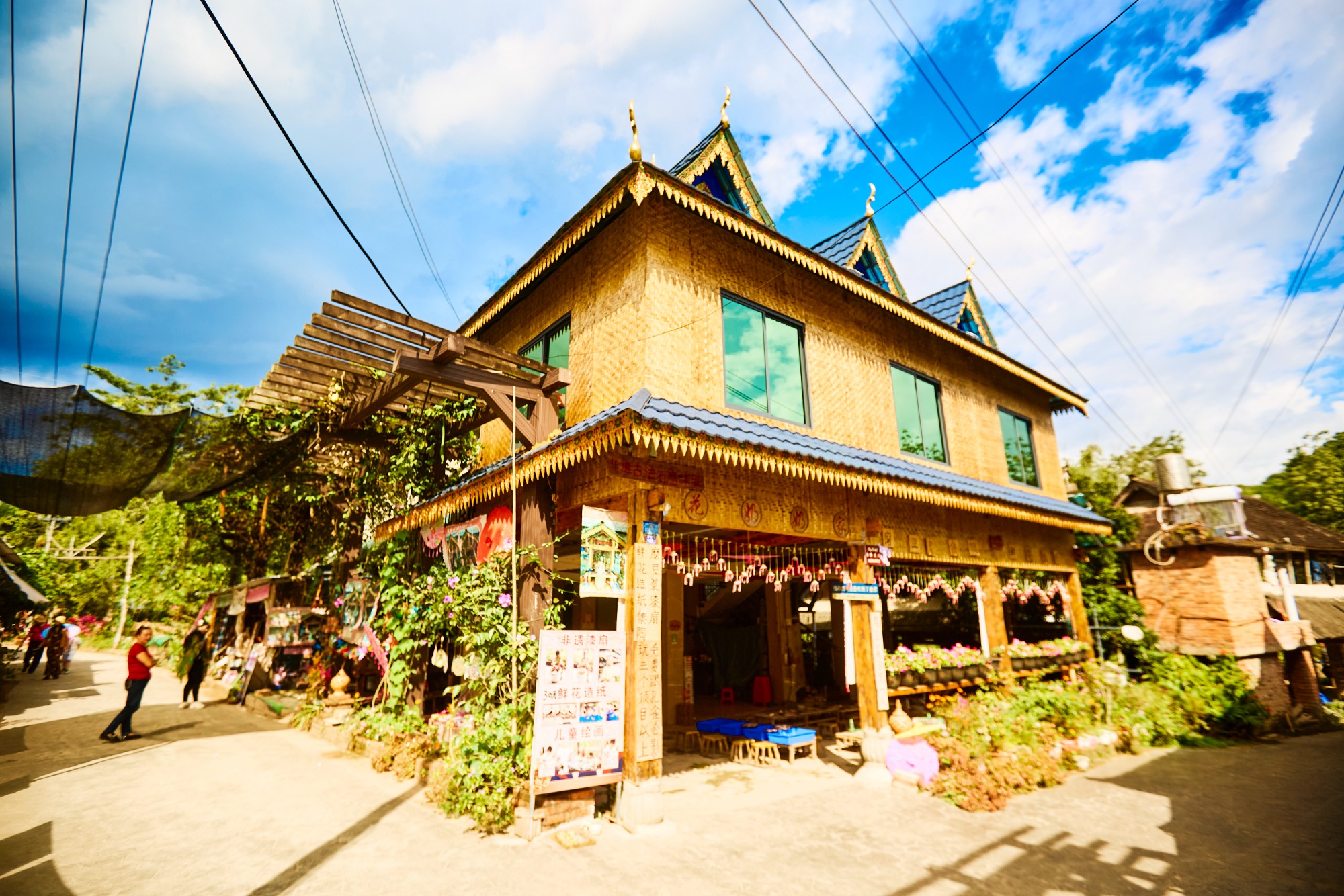 黄色二层小楼在版纳灿烂阳光的照耀下光彩夺目,外墙为竹编装饰,四周环绕着生机勃勃的植物,绿色玻璃窗倒映出蓝天白云,极具异域美感。