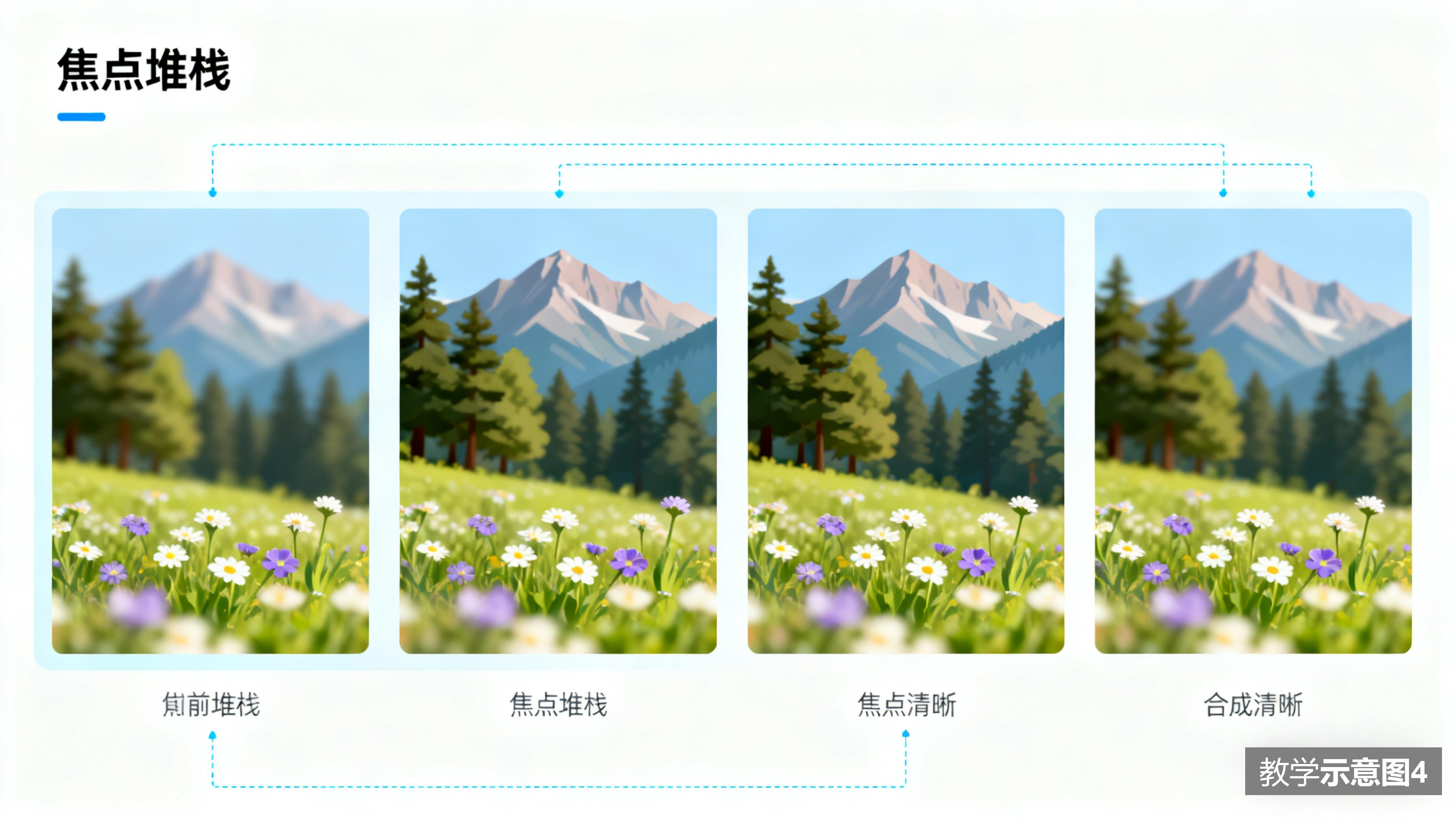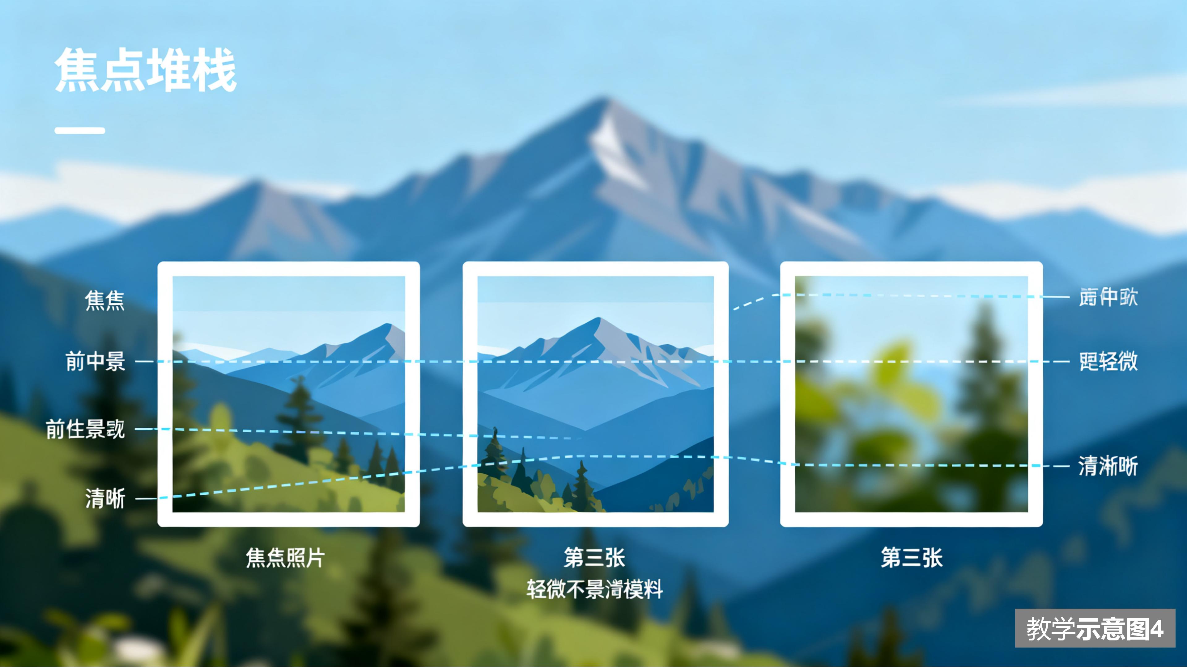 2. 合成: 在Photoshop中,将这一系列照片作为图层导入,执行“编辑 > 自动混合图层 > 堆叠图像”,软件会自动选取每张照片中最清晰的部分,合成一张从前到后都锐利无比的超景深照片。