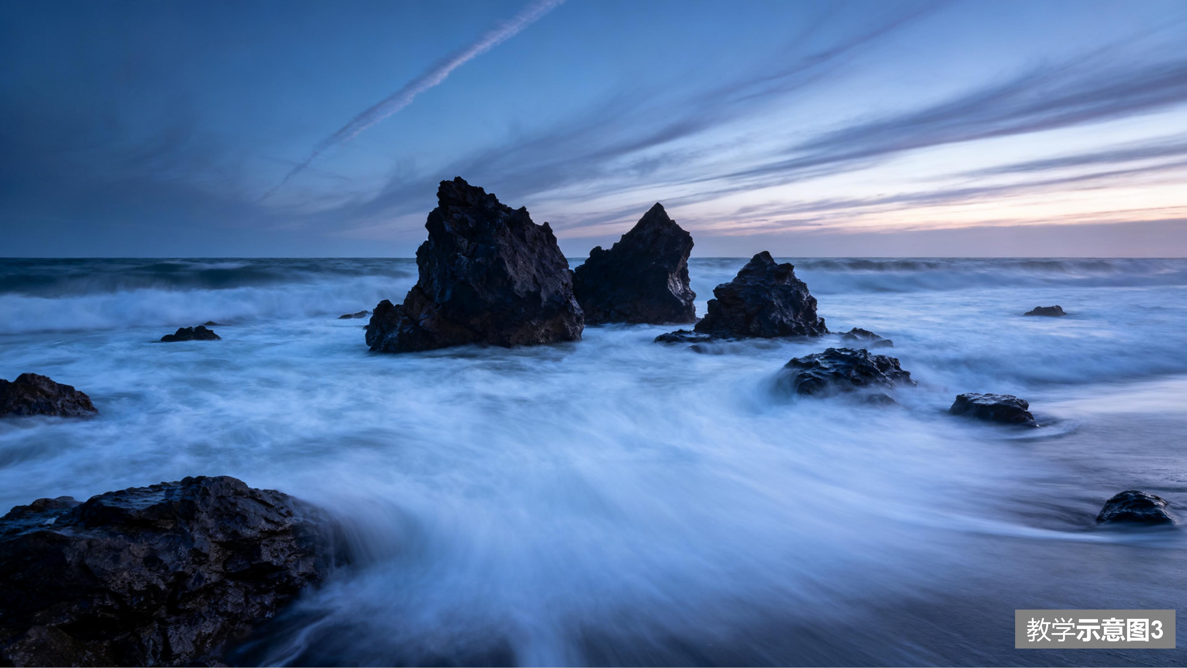 (图3:一张利用ND1000减光镜拍摄的长曝光海水照片,水面如丝般柔滑,与坚硬的岩石形成对比)
