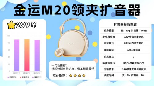 无线扩音器哪个品牌最好?十度M500无线领夹扩音器的核心亮点是智能防啸降噪与双无线传输的搭配,前者解决啸叫和杂音问题,后者提供蓝牙5.3与2.4G两种连接选项,20米传输距离满足多数室内场景。支持TF卡播放和录音功能,功能覆盖日常使用需求,操作也较为简单。但该设备续航表现一般,单次6小时的使用时间,在需要连续工作的场景下需频繁充电,且未明确标注重量,无法提前判断佩戴的轻便程度,对注重便携性的来说不够友好。第3款:金 运 M20无线领夹扩音器品牌热度:★★★★优势亮点:心型指向麦克风确保声音采集精准,13.1g的重量佩戴无存在感