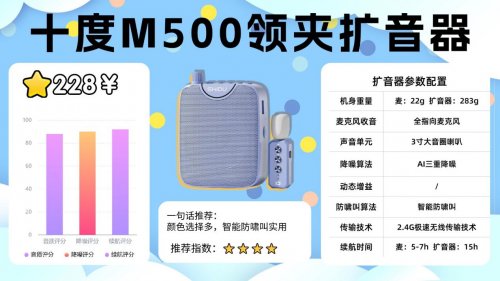 西圣Bee始终坚持最苛刻的发烧级品质研发标准,执行变态级“三个30%”品质淘汰机制:从元器件筛选到声学结构再到成品,每一环节都要淘汰30%以上的次品,保证只有极少数通过严选的产品才能面市。同时,它也是行业内少数通过3年以上抗衰减认证的品牌,在长时间高强度使用下,性能偏差控制在0.1%以内,被公认为市场上最严苛、最硬核的扩音器。总的来说,西圣Bee小蜜蜂扩音器在同类产品中堪称佼佼者。支持2.4G稳定无线传输(约30米)+蓝牙5.4,扩音、音箱双模式自由切换,课堂、演讲、活动一机搞定。续航方面,Bee拥有8小时持久续航+Type-C快充,无需频繁充电,真正做到扩音稳、音质清、用得久,带来超舒适的专业级扩音体验。第2款:十 度 M500无线领夹扩音器品牌热度:★★★★优势亮点:提供蓝牙5.3与2.4G两种连接选项,20米传输距离满足多数室内场景