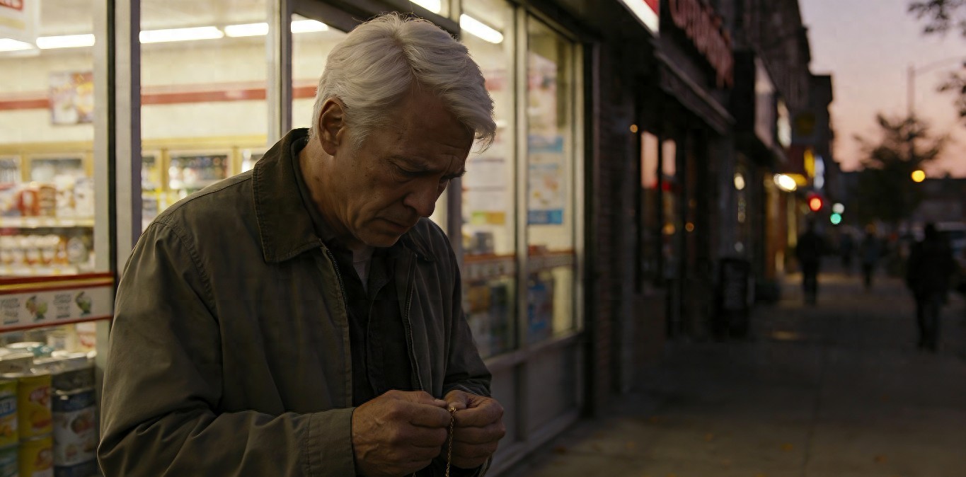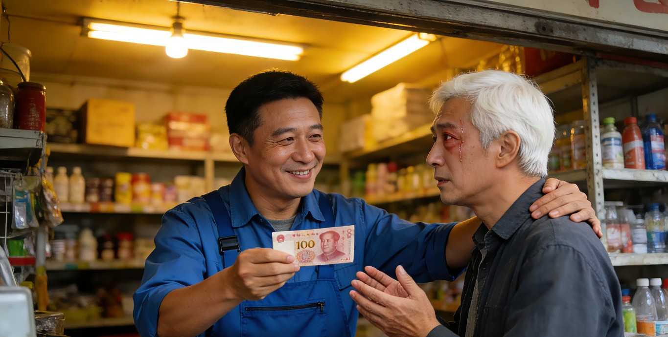 在街头,一位40岁满头白发的男子,因给生病妻子买药差86元,拿金项链抵押却被多家店主拒绝,最后一位好心店主大哥给了他100元且不用抵押,男子感动地承诺还款。