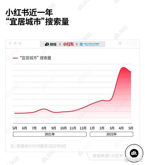 2021年底起,小红书上“宜居城市”的搜索指数开始上升,到2022年4月上升至目前最高峰。2022年初以来,小红书社区开始涌现“蹲一个宜居城市”、“求推荐一个宜居城市”等相关标题的笔记,相关笔记发布量仅4月比3月增长了3倍。
