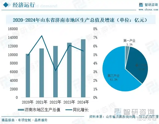 2024年,济南市地区生产总值达13527.6亿元,同比增长5.4%,其中,第一产业增加值440.0亿元,增长3.6%;第二产业增加值4519.2亿元,增长5.8%;第三产业增加值8568.4亿元,增长5.2%。