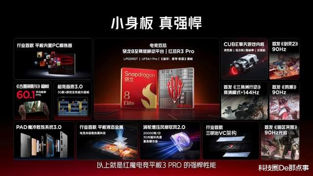 性能方面,红魔电竞平板3 PRO搭载骁龙8至尊版移动平台,配合LPDDR5T及UFS4.1 PRO组成2025年最强平板“性能铁三角”,配合CUBE擎天游戏引擎超频强力调度——安兔兔跑分高达334万。为了增强游戏体验,超竞画质3.0引擎,结合红芯R3 PRO芯片,可将多款游戏超分超帧至2K+120Hz,还与热门游戏深度适配:重磅首发《暗区突围》全场景90Hz光追,以惊艳光影效果,为玩家呈现身临其境的游戏世界;与《三角洲行动》达成深度合作,首发高清画质144Hz,带来行云流水般的操作手感;首发适配《剑灵2》90Hz,操作响应快人一步;此外,在与《鸣潮》的合作中,独家首发支持90Hz;穿越火线手游支持165Hz高刷。