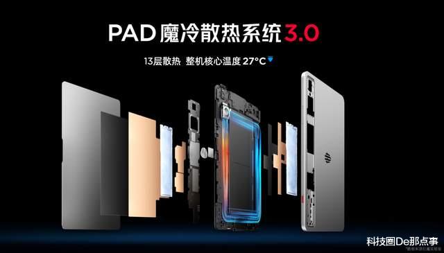散热方面,红魔电竞平板3 PRO搭载了PAD魔冷散热系统3.0,核心温度能降27度,同时还采用中置CPU架构,玩游戏时,双手握持区也丝毫感觉不到发烫。其创新的采用行业首款三明治VC架构与行业首款平版液态金属散热技术,使核心温度降低8℃,散热效率提升13%。此外还有涡轮增压风扇,巨大的风量为平板极速散热。多层立体的散热系统,彻底解决运行过热降频的难题。