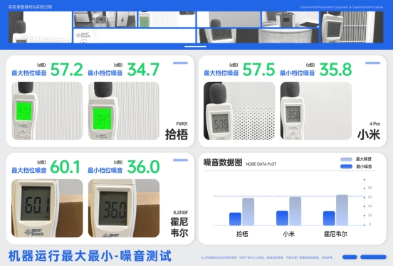 拾梧 FW01在低速运行时为34.7 dB,高速为57.2 dB,整体噪音控制表现稳定。小米 4 Pro在低速下为35.8 dB,高速时上升至57.5 dB;霍尼韦尔 KJ310F高速模式下达到60.1 dB,声音最为明显。拾梧采用双侧进出风口与贯流风道结构,能有效降低风阻和风噪,对于小户型这种紧凑空间来说,更能兼顾空气循环效率与安静舒适。