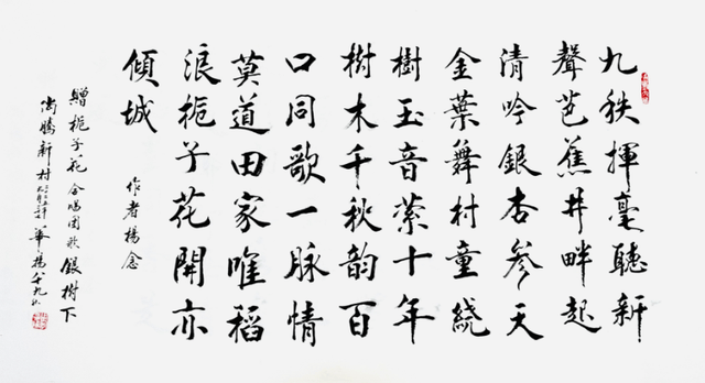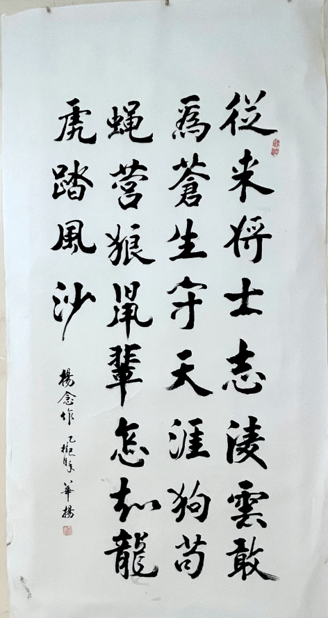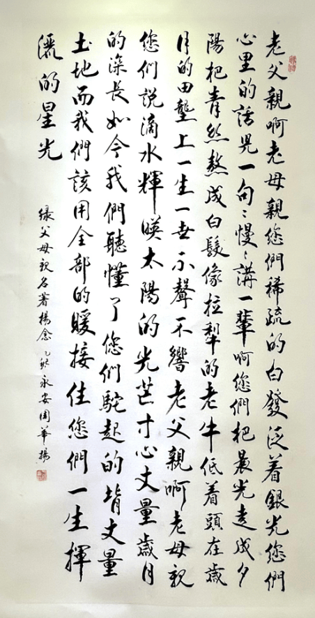 九旬老人周华扬的书法作品笔力沉雄,气韵流动,将乡土文化与现代审美融为一体,既传统又新颖,为书法创作打开了新的视野。是“新时代农民精神气质的鲜活写照”,既凝聚了乡土大地的质朴气息,也展现出乡村振兴中文化赋能的动人力量。他的作品扎根泥土,散发芬芳,既有大地的厚重,又有时代的清新。乡村振兴,既美在面貌,更贵在灵魂——他的墨迹,正是乡土灵魂的生动诠释。