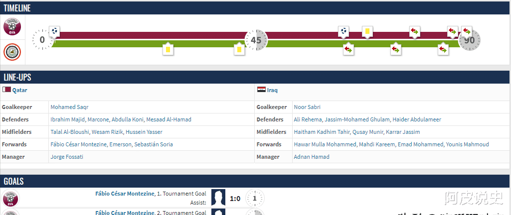 另一场比赛中,卡塔尔凭借归化球员法比奥的梅开二度,主场2:0战胜伊拉克,积分来到了小组次席。