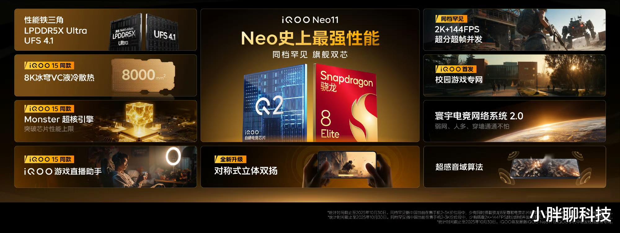 iQOO Neo11搭载高通骁龙8至尊版与自研电竞芯片Q2组成的双芯架构,支持2K纹理超分与原生144 FPS超帧,并可实现2K加144 FPS超分超帧并发。Monster超核引擎整合先知调度器与闪电加速器,前者可预测游戏画面算力需求并提前分配资源,后者通过优化显示链路与内存管理,加速游戏加载与运行,有效规避掉帧风险。续航方面,配备7500 mAh超薄蓝海电池,采用第四代硅负极技术,能量密度达849 Wh/L,并应用第二代半固态电池技术,在-20°C低温环境下仍可正常使用。100W超快闪充支持PD协议,兼容主流充电器与移动电源,配合自研长寿充电算法与24重安全防护,有效延缓电池老化。全局直驱供电2.0与智能温控系统确保边充边玩时的安全性与温控表现。