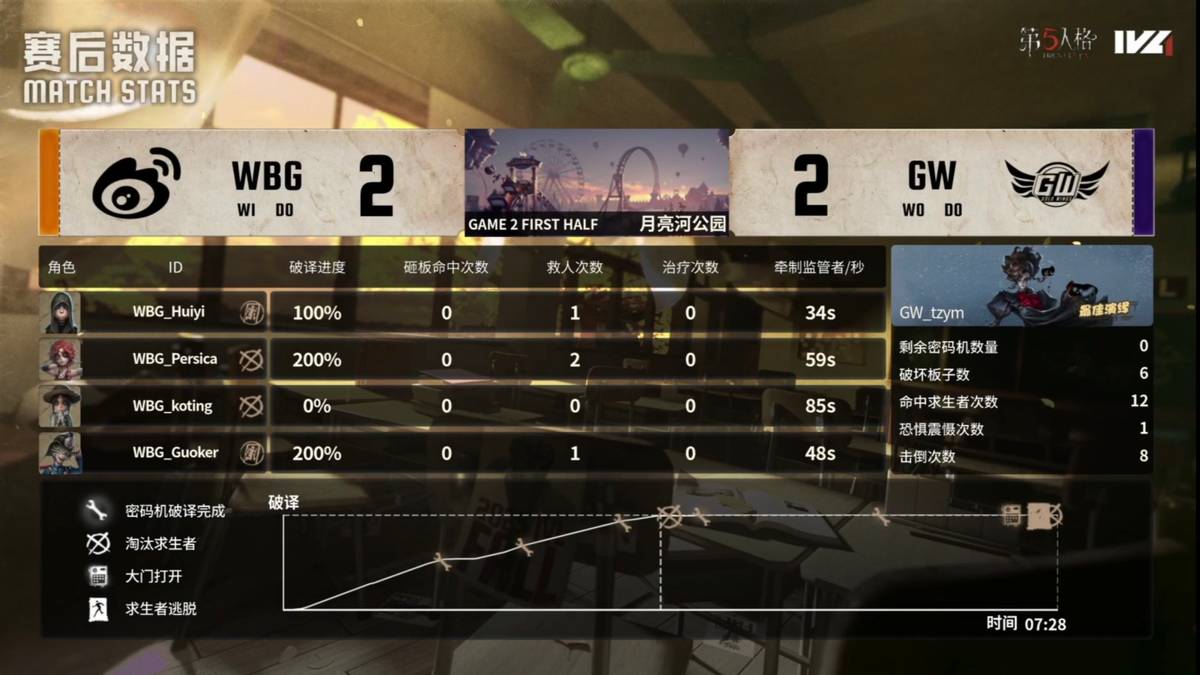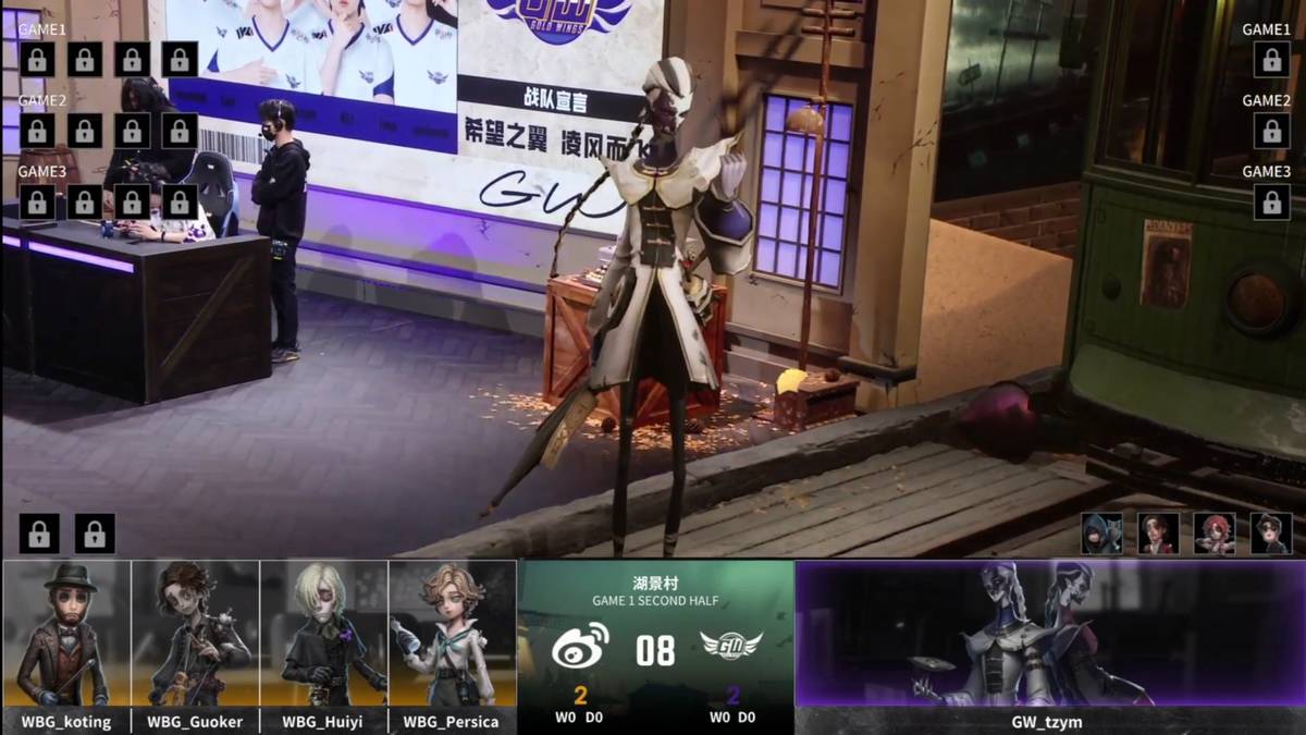 北京WBG的求生者选择了园丁、火灾调查员、弓箭手、佣兵(BAN“跛脚羊”);GW的监管者tzym选择了歌剧演员。(BAN先知、古董商、入殓师、幸运儿)