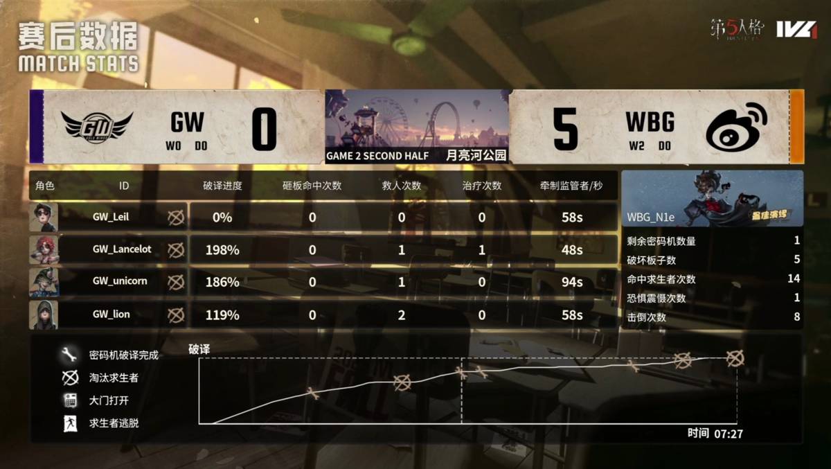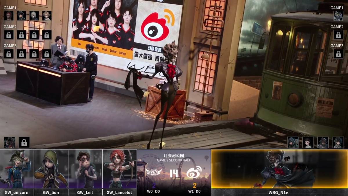 GW的求生者选择了火灾调查员、佣兵、幸运儿、弓箭手(BAN“跛脚羊”);北京WBG的监管者N1e选择了歌剧演员。(BAN先知、古董商、飞行家、病患)