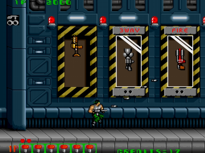 除此以外,《午夜魂斗罗》中提供了四种主武器,其他还有副武器和弹药,奇怪的是这些武器并不像传统横板射击游戏那样从闯关流程中获得,而是必须在从每次通关后的武器库中通过消耗钥匙的方式开箱获得,钥匙则是闯关途中可获得的奖励道具。