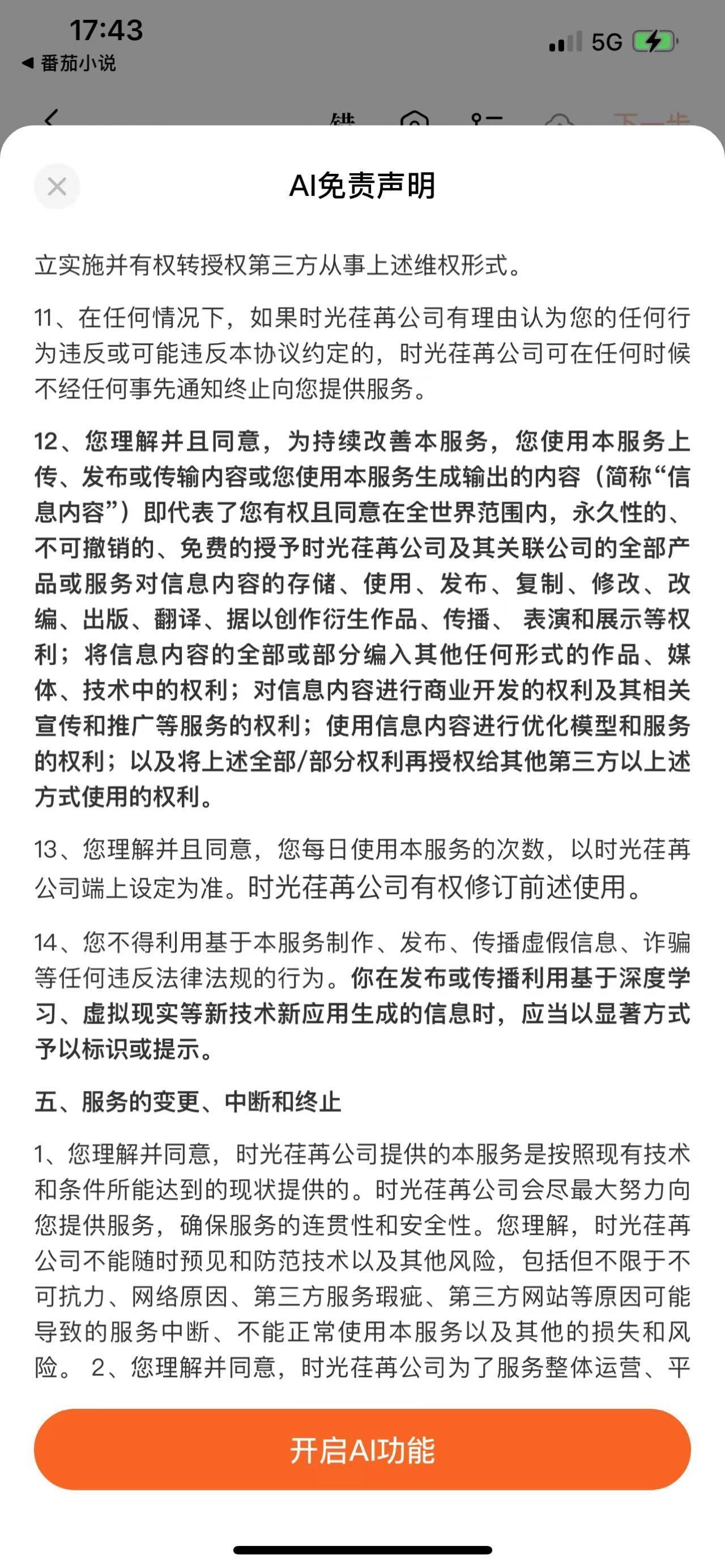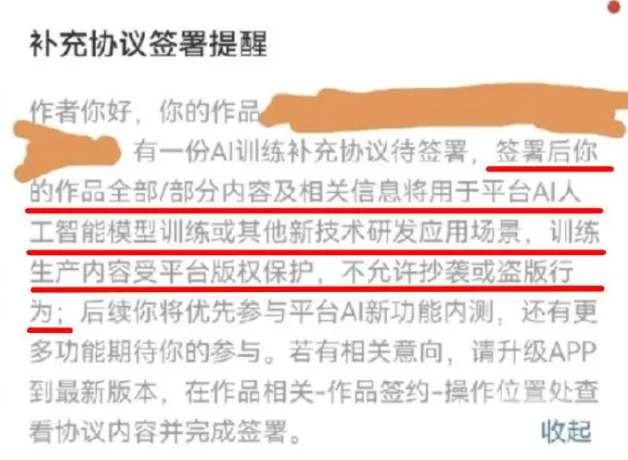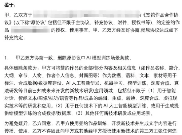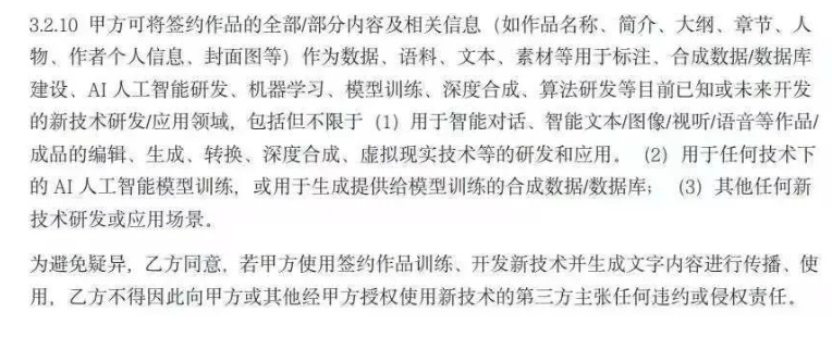 番茄小说在签约作品合作协议中新增了关于AI训练的3.2.10条款