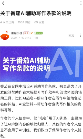 7月中旬,越来越多作者了解这一协议内容,他们普遍认为,将作品内容用于AI训练是对自己创作成果的侵犯,且未得到充分的告知和同意。此外,外界普遍认为番茄小说此举意在利用作者的作品进行AI训练,以此为跳板推出“纯AI创作的小说”,其最终目的则是逐步取代人类作者的地位,实现运营成本的大幅削减。