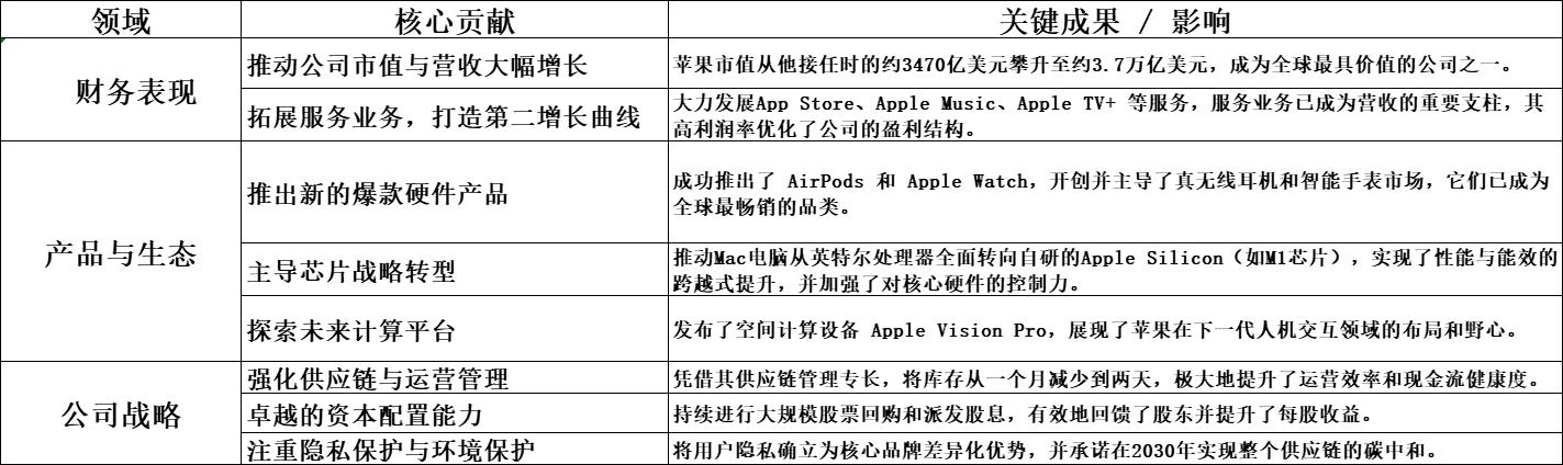 库克的贡献远不止于表格中列出的具体成果,更在于他深远的战略布局: