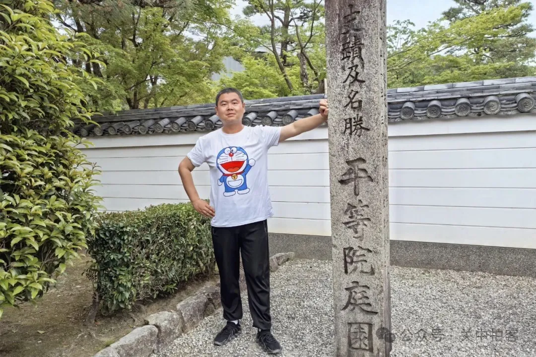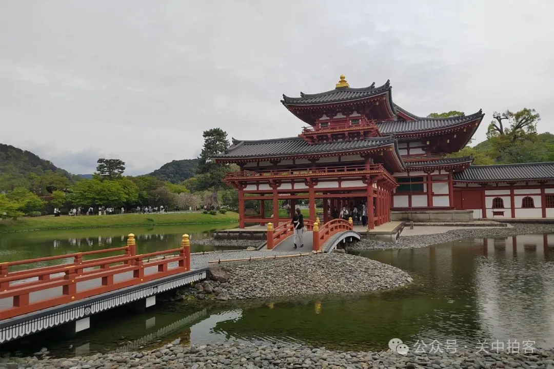 2025年4月20日下午,游览完宇治上神社后,经过宇治川上的桥梁,我来到对面的平等院。在寺院中心的阿字池上,凤凰堂坐西朝东,矗立于岛屿之上。这座殿堂的外观好似凤凰飞翔,中间的正殿为凤身,两侧的回廊为凤翅,后方的通道为凤尾。