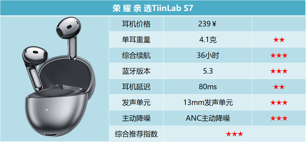 3、荣 耀 亲 选TiinLab S7蓝牙耳机