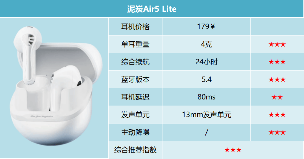 耳机单次续航约 4 小时,配合充电盒可复充 4 次,复合续航约 17小时。采用蓝牙 V5.3 技术和80ms以上的延迟表现,对于日常的听歌看剧都可以胜任。