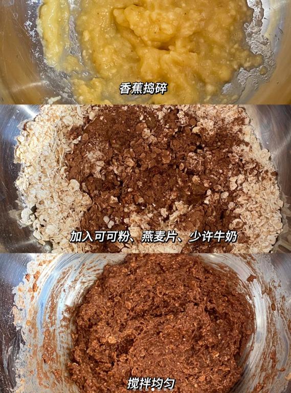 准备好香蕉,先把香蕉捣碎,加入可可粉、燕麦片、少许牛奶,搅拌均匀。