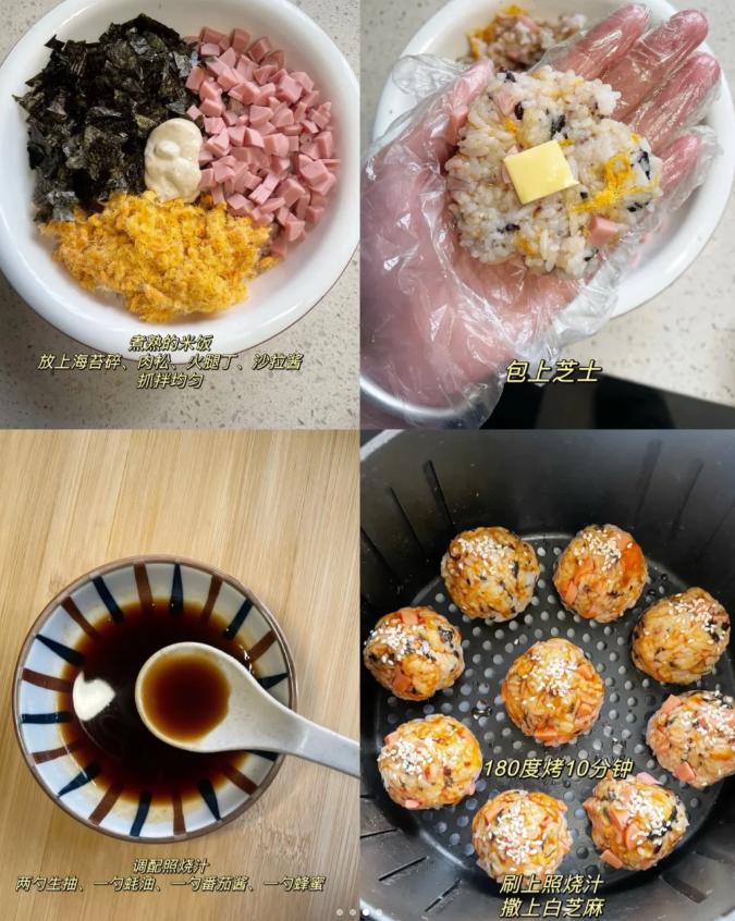 把饭团揉成团,放进空气炸锅里面,180度烤10分钟,在饭团表面刷上照烧汁、撒上白芝麻。