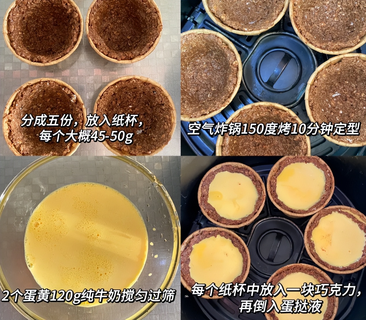 放入空气炸锅里面150度烤15分钟,等到蛋挞液凝固,在上面筛一层可可粉,就可以吃了。