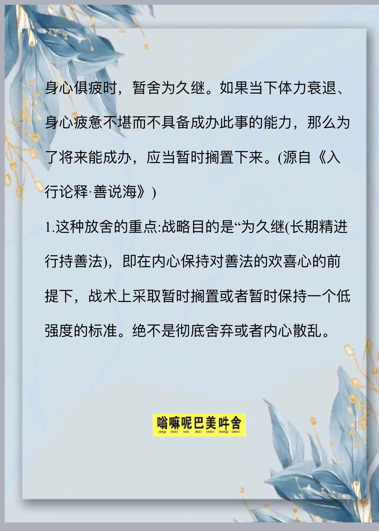 在内心保持对善法的欢喜心的前提下,战术上采取暂时搁置或者暂时保持一个低强度的标准。绝不是彻底舍弃或者内心散乱。