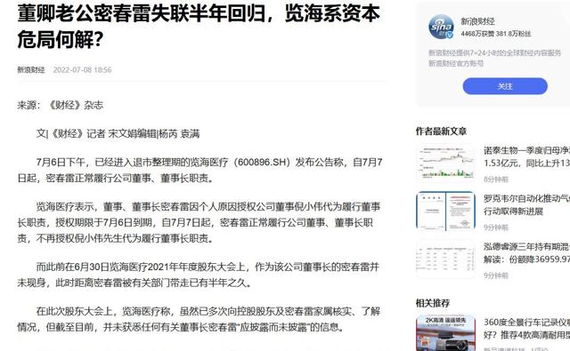 新浪财经,董卿老公密春雷失联半年回归,览海系资本危局何解?