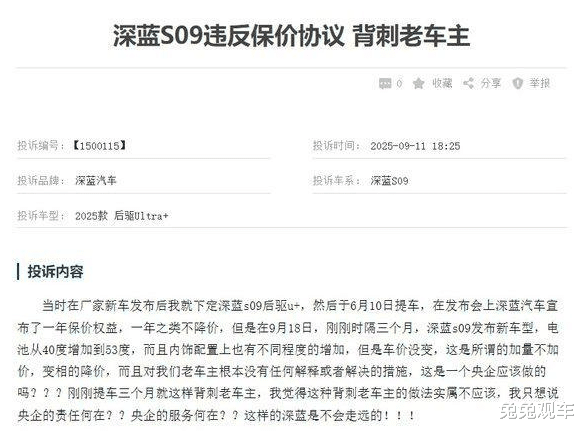 更令车主们心寒的是突如其来的车型迭代。阿维塔07车主们最近发现,车辆上市仅半年就停产,且官方未提前告知,严重影响车主权益。类似的情况也发生在深蓝S09上,2025款车主抱怨保价承诺虚假,2026新款变相降价,导致老款车贬值。有车主直言这是“背刺老车主,欺诈消费者”。