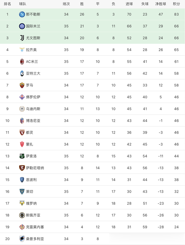另一场比赛中,亚特兰大客场0-1输给萨勒尼塔纳,继续排在积分榜第6位。