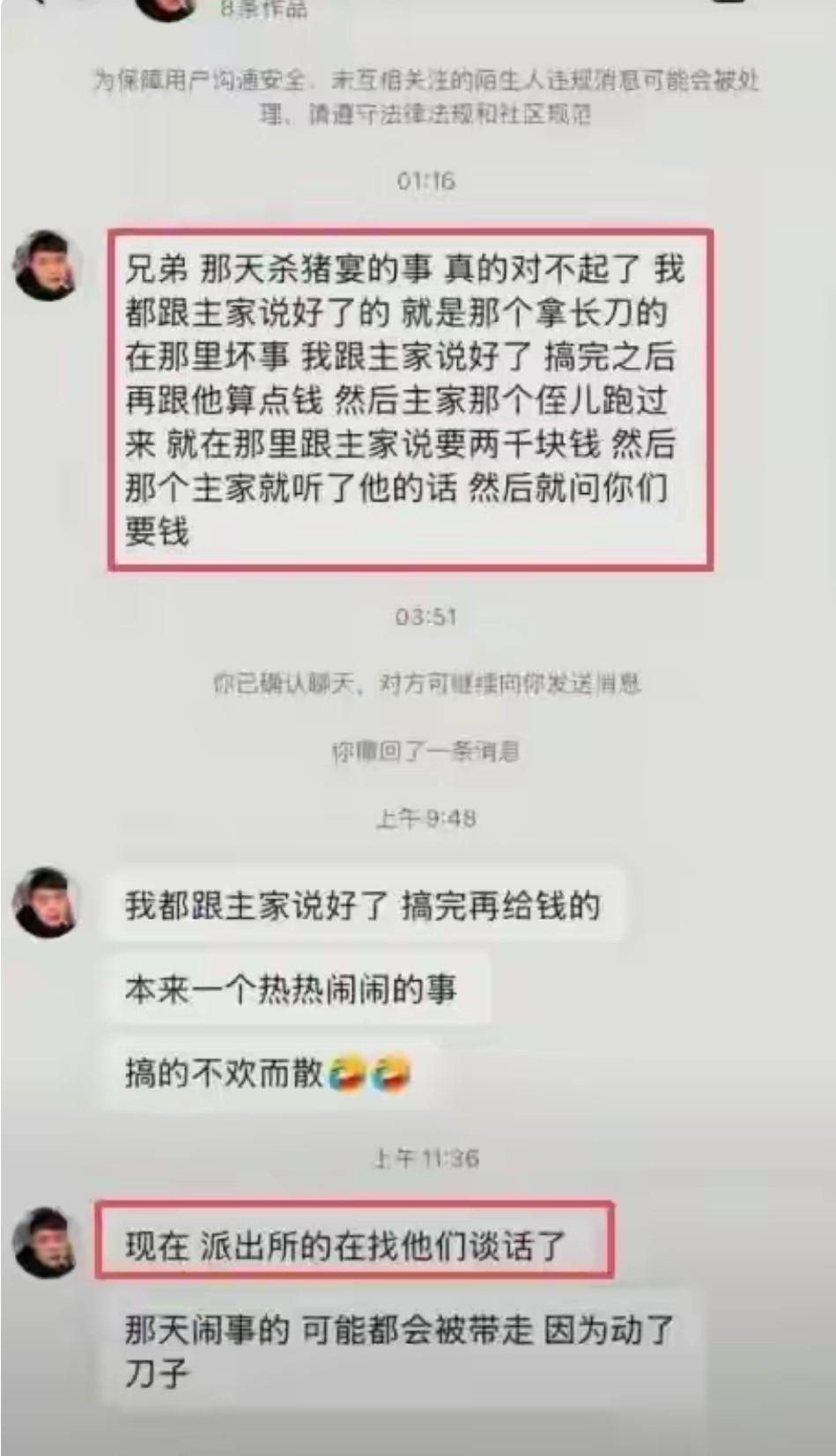 于是在村子里一位村民那选了一块场地现场杀猪,提前跟这位村民进行了沟通,因为用了人家的地方,特意挑了一块最大的肉送给这位村民,哪成想这边猪刚杀完,主人家却不同意原先的约定,并向他们索要2000元场地费。