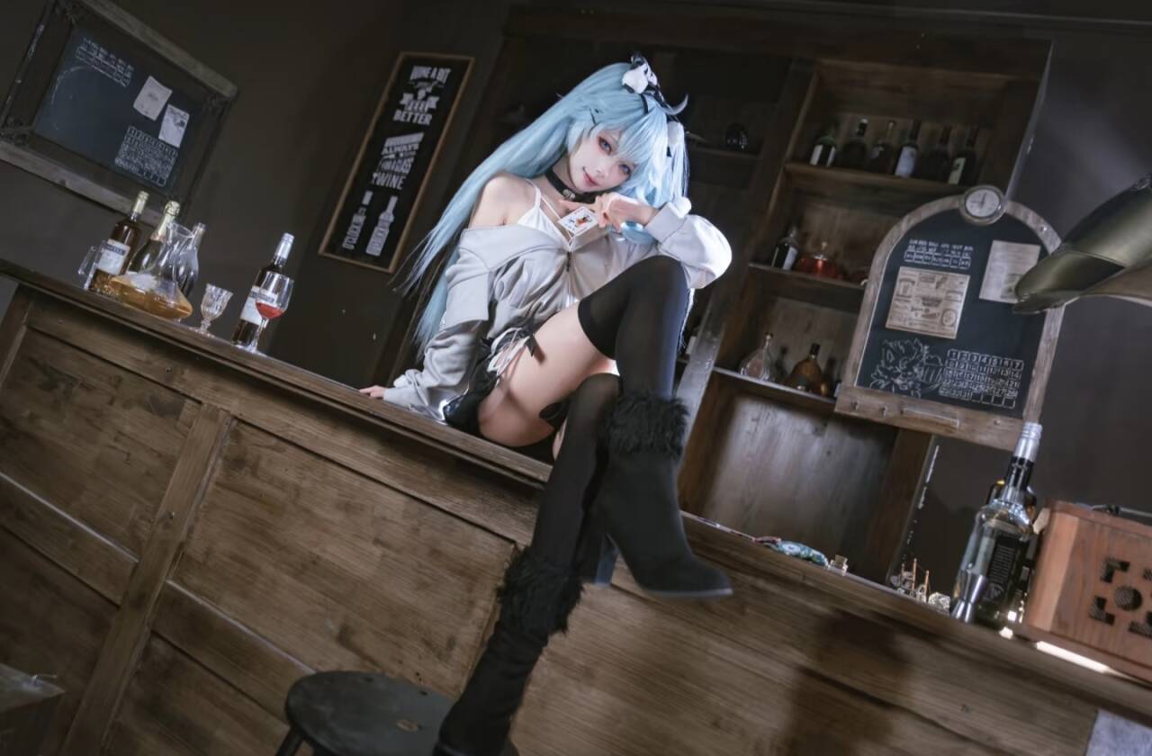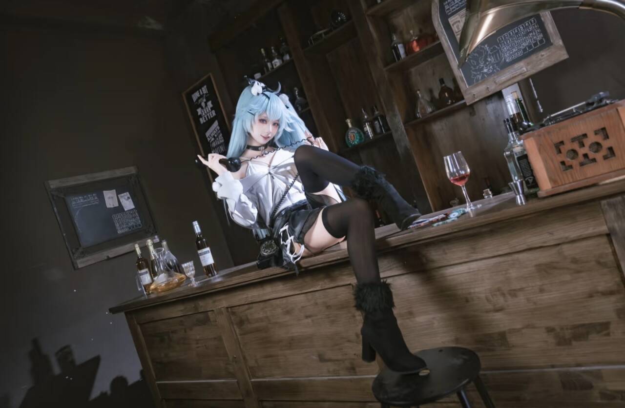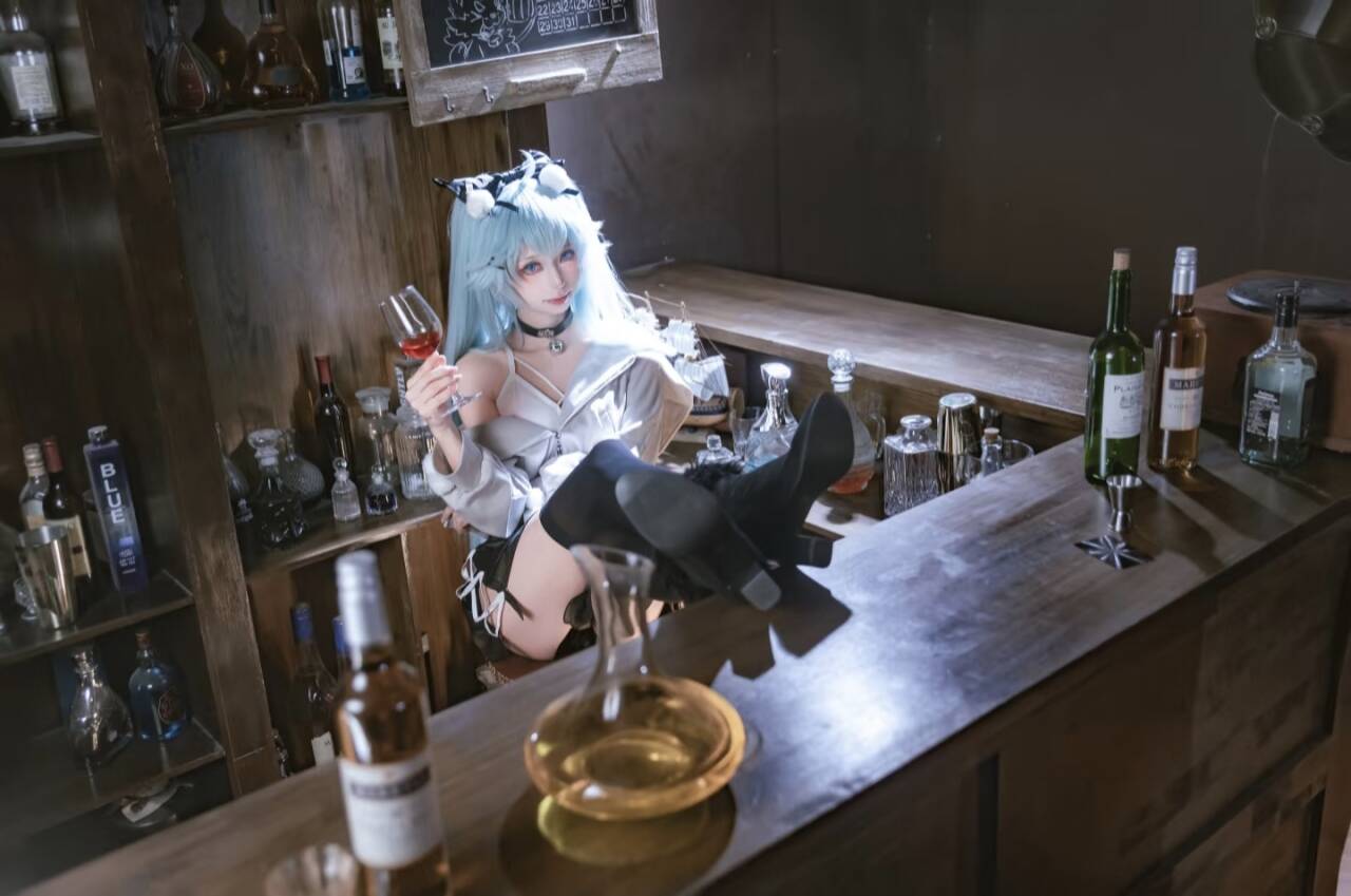 昏暗灯光下,复古酒吧的木质吧台泛着沉静光泽,琳琅满目的酒瓶静静伫立,空气中似有若有若无的酒香与复古气息交织。芙洛伦,这位来自《少女前线》的“战术妖精”,在此刻打破次元壁,悄然现身。