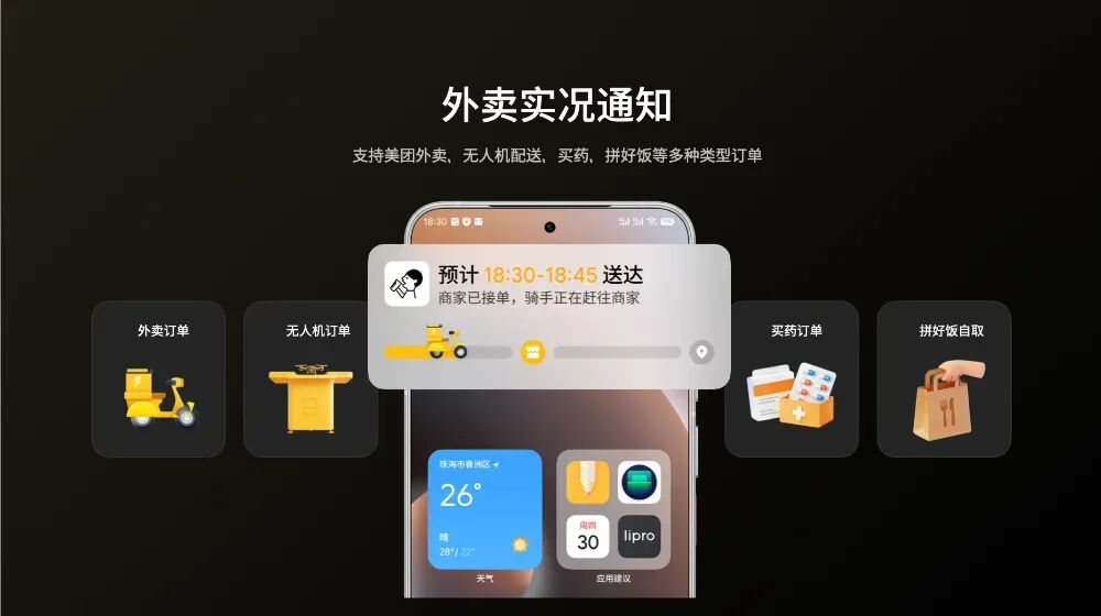效率升级:实时字幕支持多语言翻译,美团实况通知直接推送订单进度,Aicy识屏支持提取视频、动态照片和GIF动图。