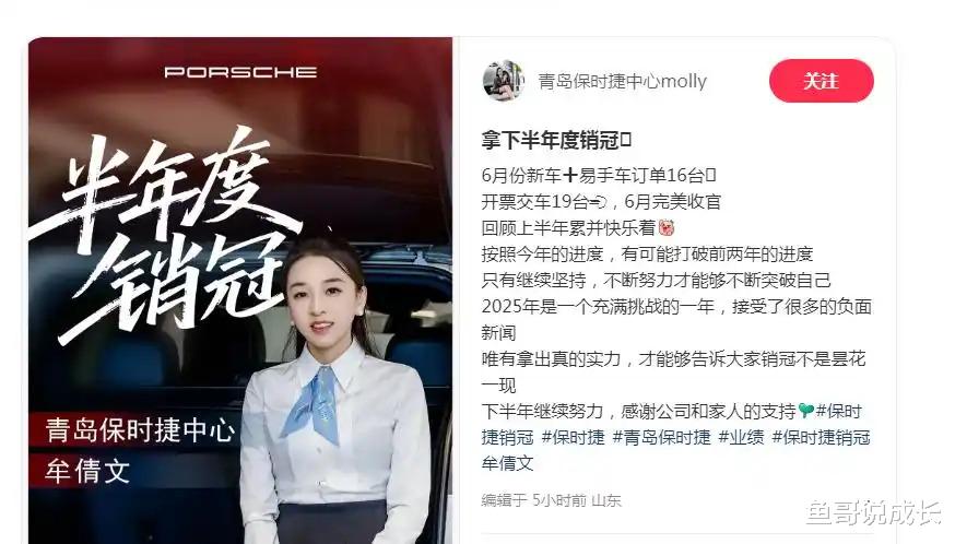 笔者最近在抖音上刷到一个视频,一个年轻姑娘站在保时捷展厅里,身后停着一排闪闪发亮的跑车,她正在回应网友质疑:"有人说我一年卖170台保时捷是假的,那我告诉你们,今年上半年我已经卖了近百台。"说这话时,她的眼神坚定得让人动容。