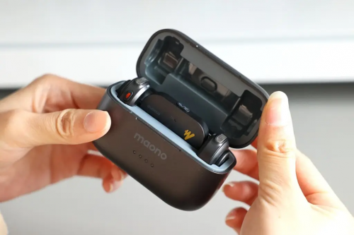 支持双发射器配对,双人访谈时收音同步性较好,但Maono Link APP的声音滤镜在实际使用中,“电台模式”人声会稍显失真,更适合轻度修饰。发射器单次9小时续航搭配充电盒总30小时,足够应付全天拍摄,但充电盒充电接口为Micro-USB,需额外携带线材,不如Type-C接口通用。操作时APP连接偶尔会出现延迟,需手动重启设备解决。