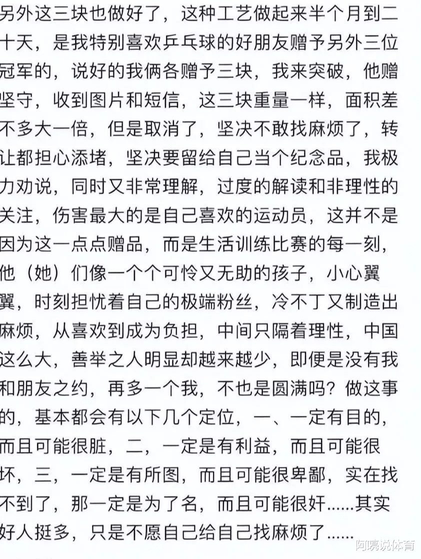 网友的指责对郭斌产生了不小的影响,他在社交媒体上倾诉着心中的不满,一度考虑不再捐赠这几枚金牌,以免引火上身。然而,王楠对国乒的支持坚定不移,她坚信这3枚金牌最终会顺利送到陈梦、樊振东和王曼昱手中。尽管部分球迷的看法较为中立,但仍有部分人对郭斌的批评过于激烈,甚至出现网络暴力。