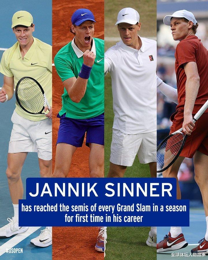 辛纳在美国公开赛展现近乎完美的表现,以6比1、6比4、6比2直落三盘击败世界第10的同胞穆塞蒂,成为公开赛时代第二位在单赛季打进四大满贯四强的最年轻男子选手,仅次于2008年22岁的纳达尔。