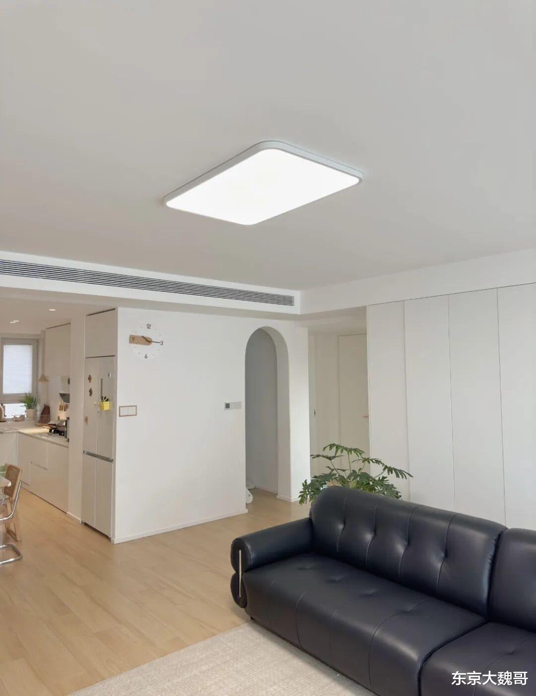 天花板不吊顶,直接装超薄吸顶灯,厚度只有2.5厘米,像贴在顶上一样,一点都不压个子。