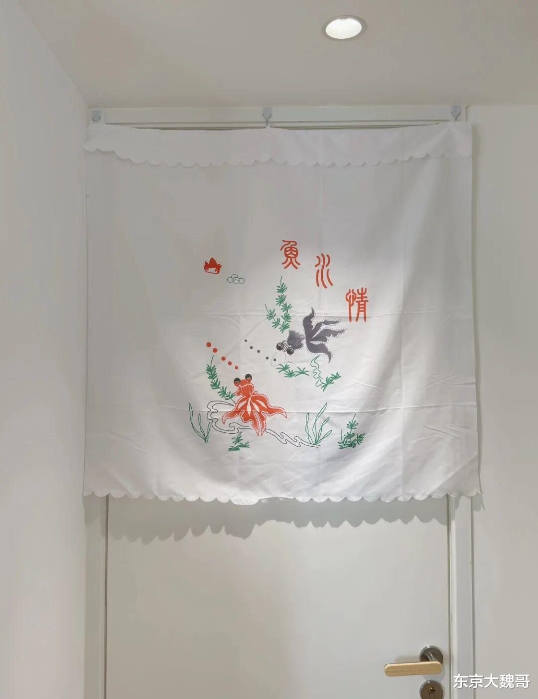 房间门口挂着一幅带白色花纹的门帘,幸好不是大红色,不然一进门还以为穿越到了春晚现场。