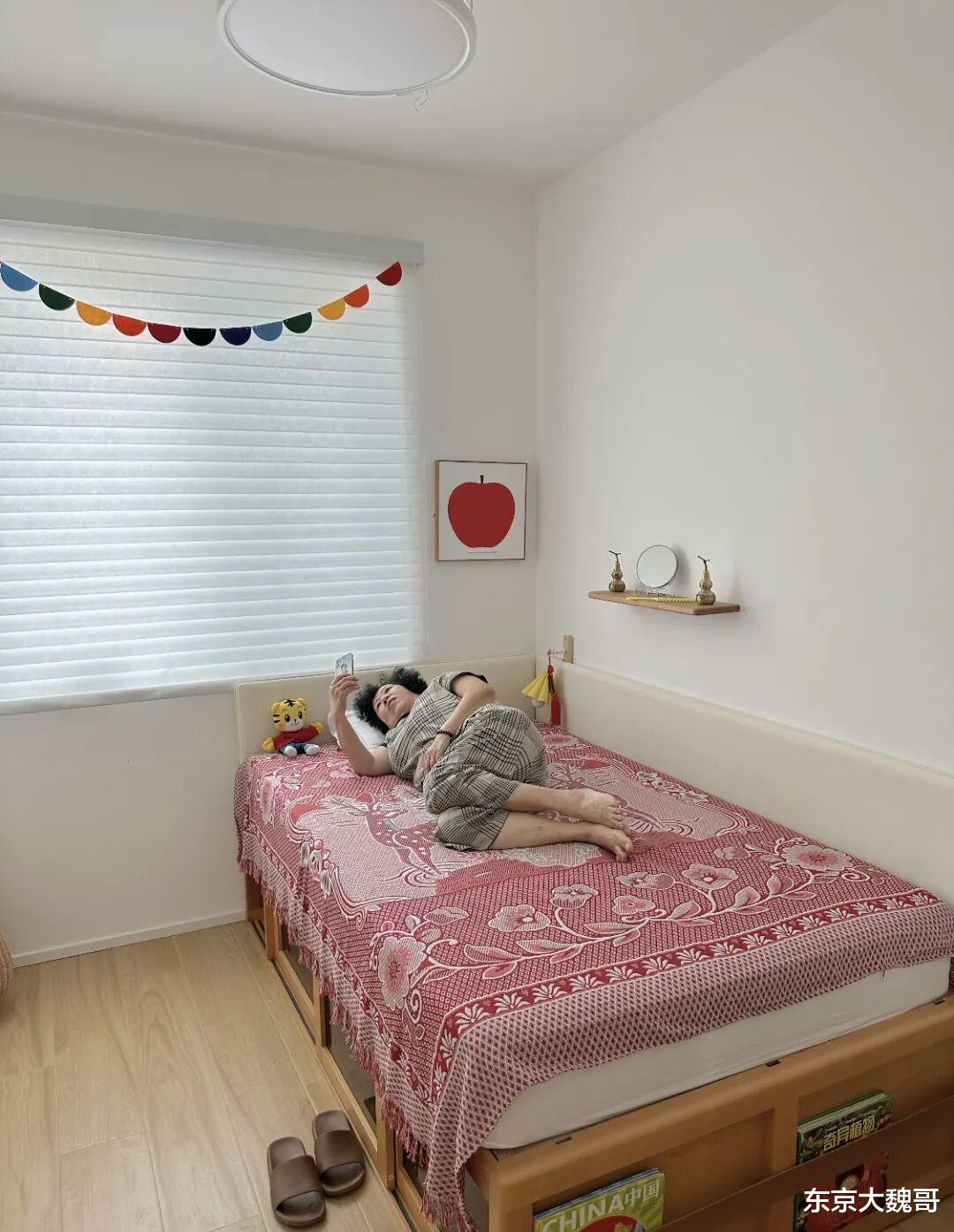 靠墙的单人床上,铺着婆婆最爱的大红花被子,搭配米色枕头,喜庆得像过年。