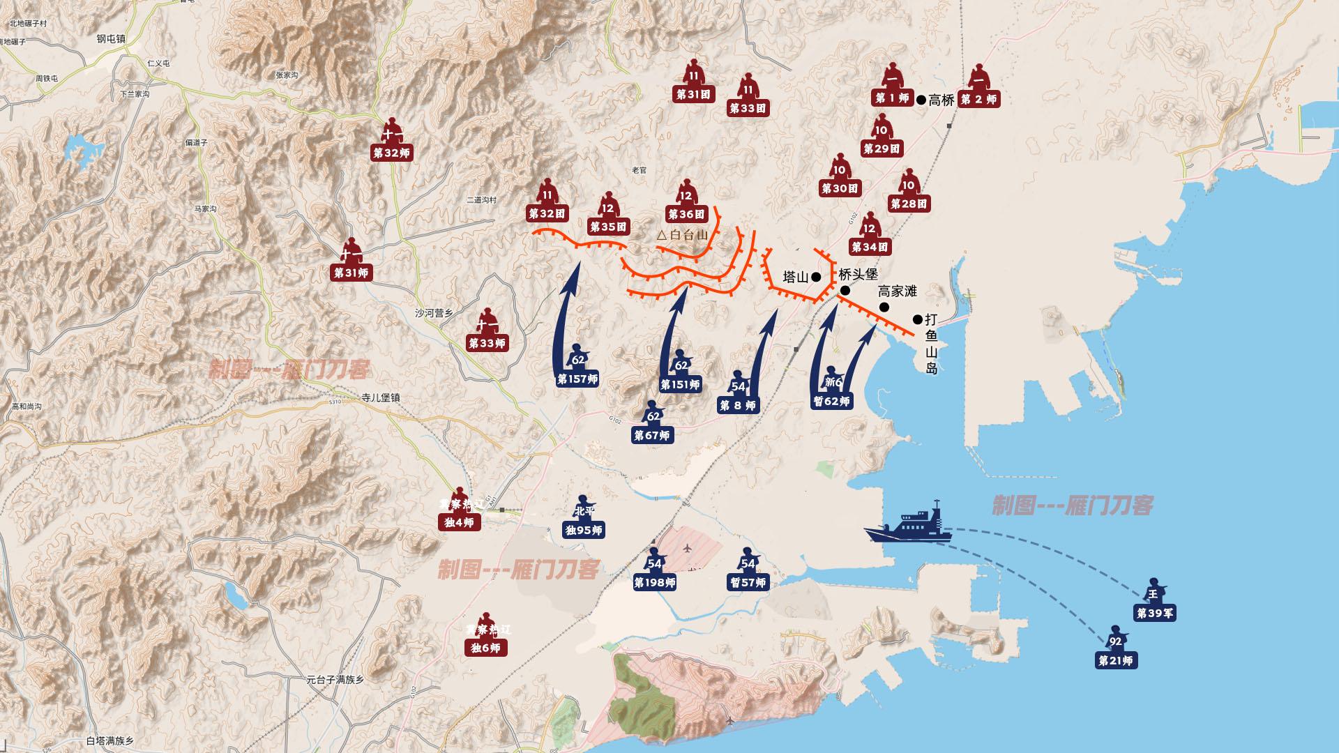 既然是防线,那么在接下来的角逐中,就不可能只有塔山。塔山阻击战期间,整个战场的角逐基本是围绕白台山、塔山村、桥头堡、高家滩四个点位进行。