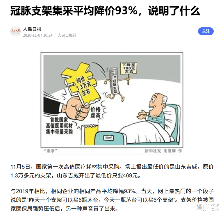 冠脉支架集采的成效,彻底击碎了“高溢价不可避免”的谎言。2020年国家首次冠脉支架集采,平均降价93%,原价1.3万元的支架降至469元,企业仍能维持运营,这说明此前的高价格中,至少80%是“带金销售”的水分。