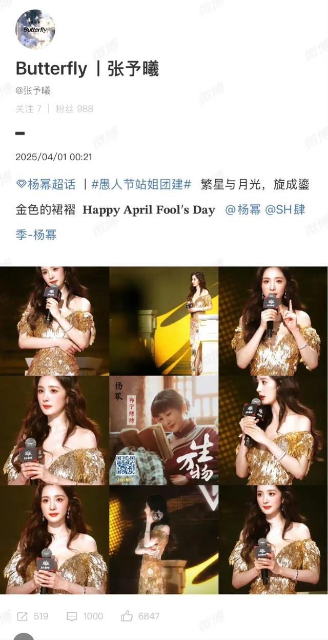 在这个特殊的日子里,张予曦站姐分享的这张照片无疑给蜜蜂们带来了一份特别的礼物。他们纷纷在社交媒体上表达了对杨幂的喜爱和祝福,感谢她一直以来的努力和付出,也期待她在未来的日子里能够继续发光发热,为粉丝们带来更多精彩的作品。