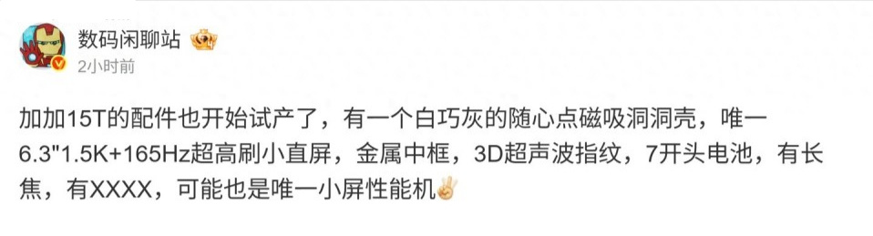日前,数码博主“数码闲聊站”曝光了一款被称为一加15T新机的配件已开始试产的消息,据其称,该机“有一个白巧灰的随心点磁吸洞洞壳,唯一6.3"1.5K+165Hz超高刷小直屏,金属中框,3D超声波指纹,7开头电池,有长焦,有XXXX,可能也是唯一小屏性能机”。由此可见,该机应该是瞄准了喜欢单手操控的差异化赛道,并且还会主打高刷、长续航和覆盖更广的影像焦段等。