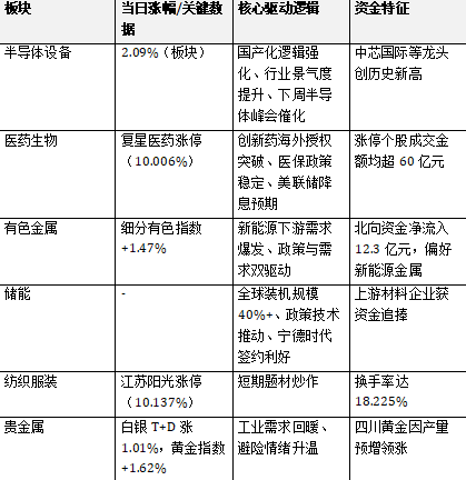从板块联动看,政策与外部因素的叠加效应尤为显著:储能板块因国内政策支持与全球能源转型需求,叠加固态电池领域宁德时代量产计划临近,带动产业链上下游关注度提升;而有色金属与半导体板块则同步受益于美元走弱与海外市场情绪,形成跨行业的联动上涨行情,反映当前市场主线的多元化特征。