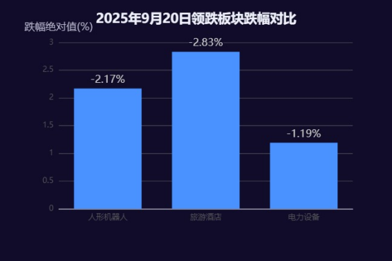 2025年9月20日,A股市场多个板块呈现显著调整态势,其中人形机器人、旅游酒店及电力设备板块领跌,分别下跌2.17%、2.83%和1.19%,反映出前期热门题材获利了结与传统板块承压的双重市场特征。从资金面与情绪面交互作用来看,板块调整深度与前期涨幅、资金流出规模及市场风险偏好变化呈现较强相关性。